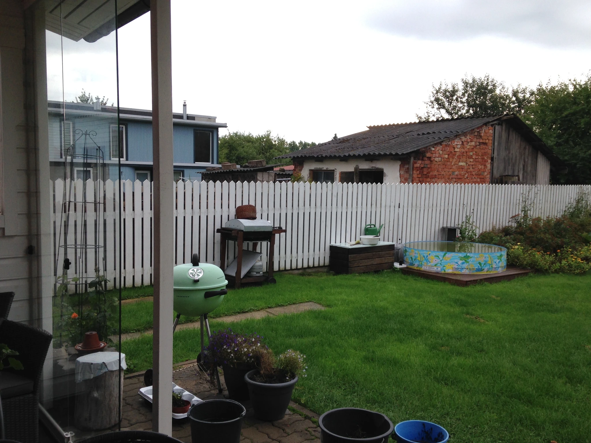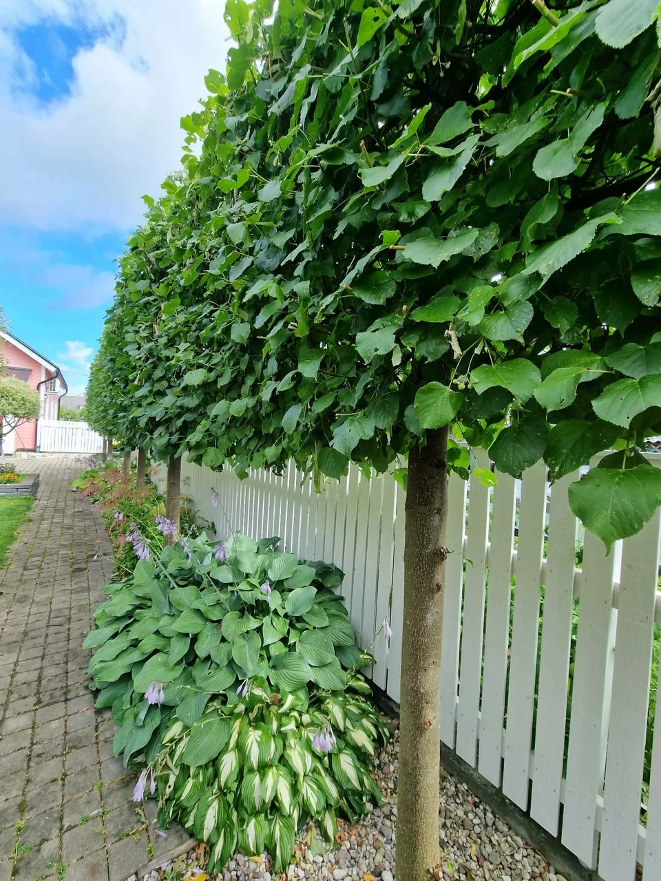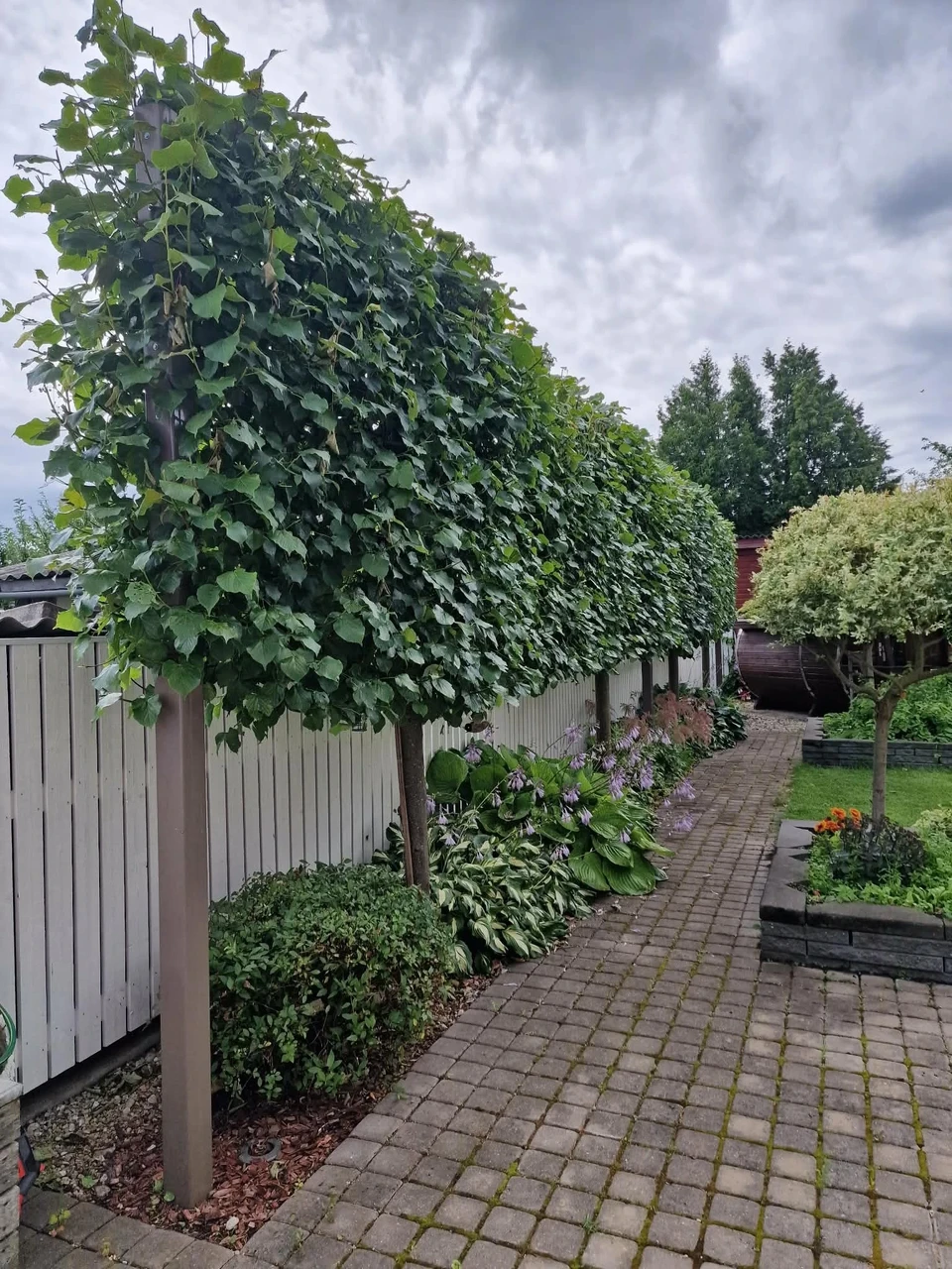 Et spaleer sai valitud kõrge tüvega, siis selle alla läksid kasvama hostad. Võrast allpool varjab naabrivaadet uuendatud valge lippaed.
