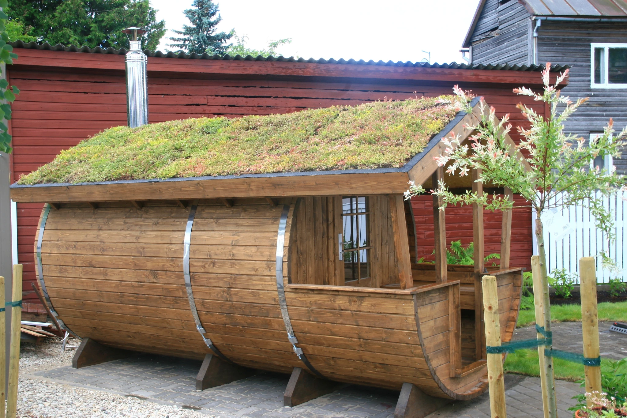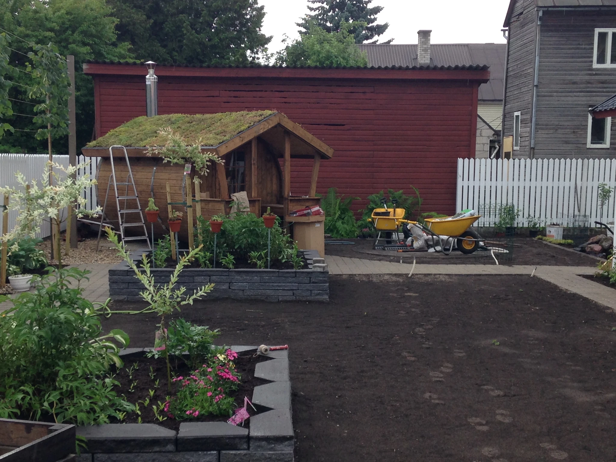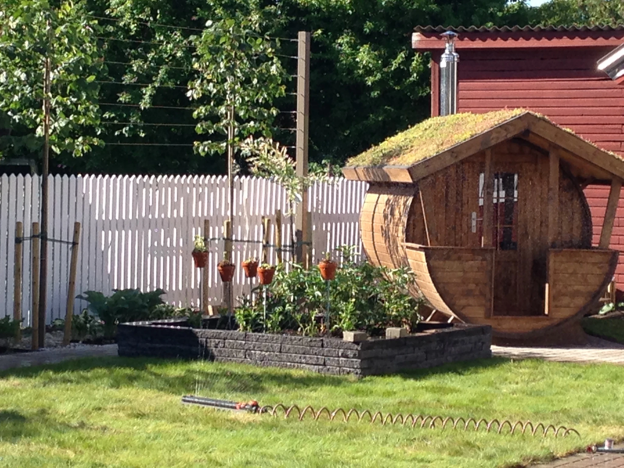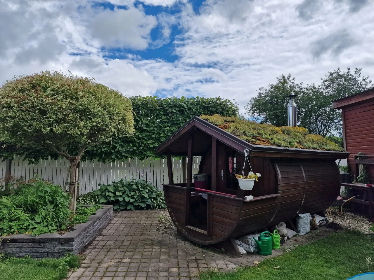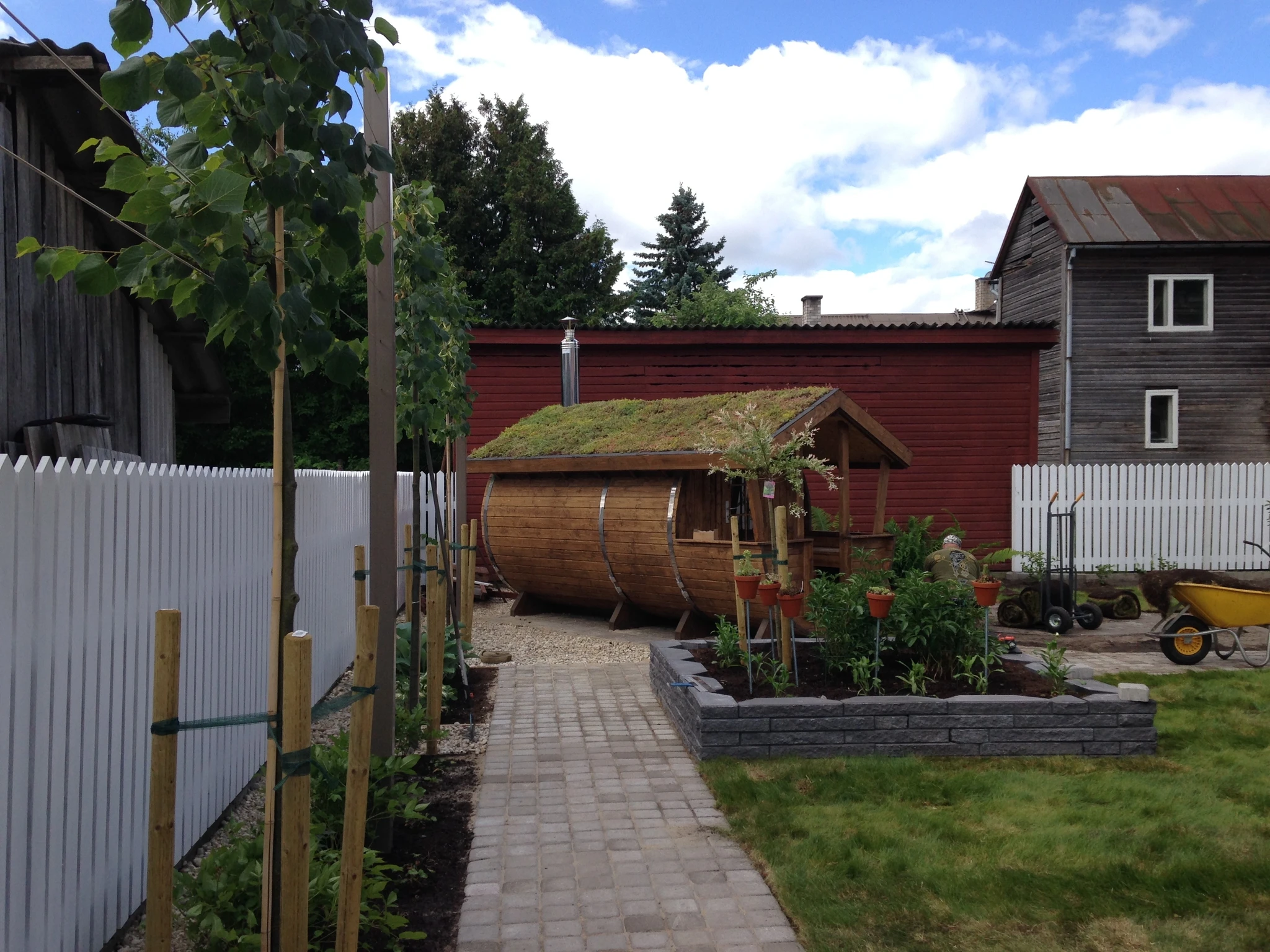 Tünnisauna katusele läksid kasvama ettekasvatutud kukeharjamatid. Sauna kõrvale sillutuskivialusele väike teisaldatav bassein West Highland terjerist koer Nappi´le.