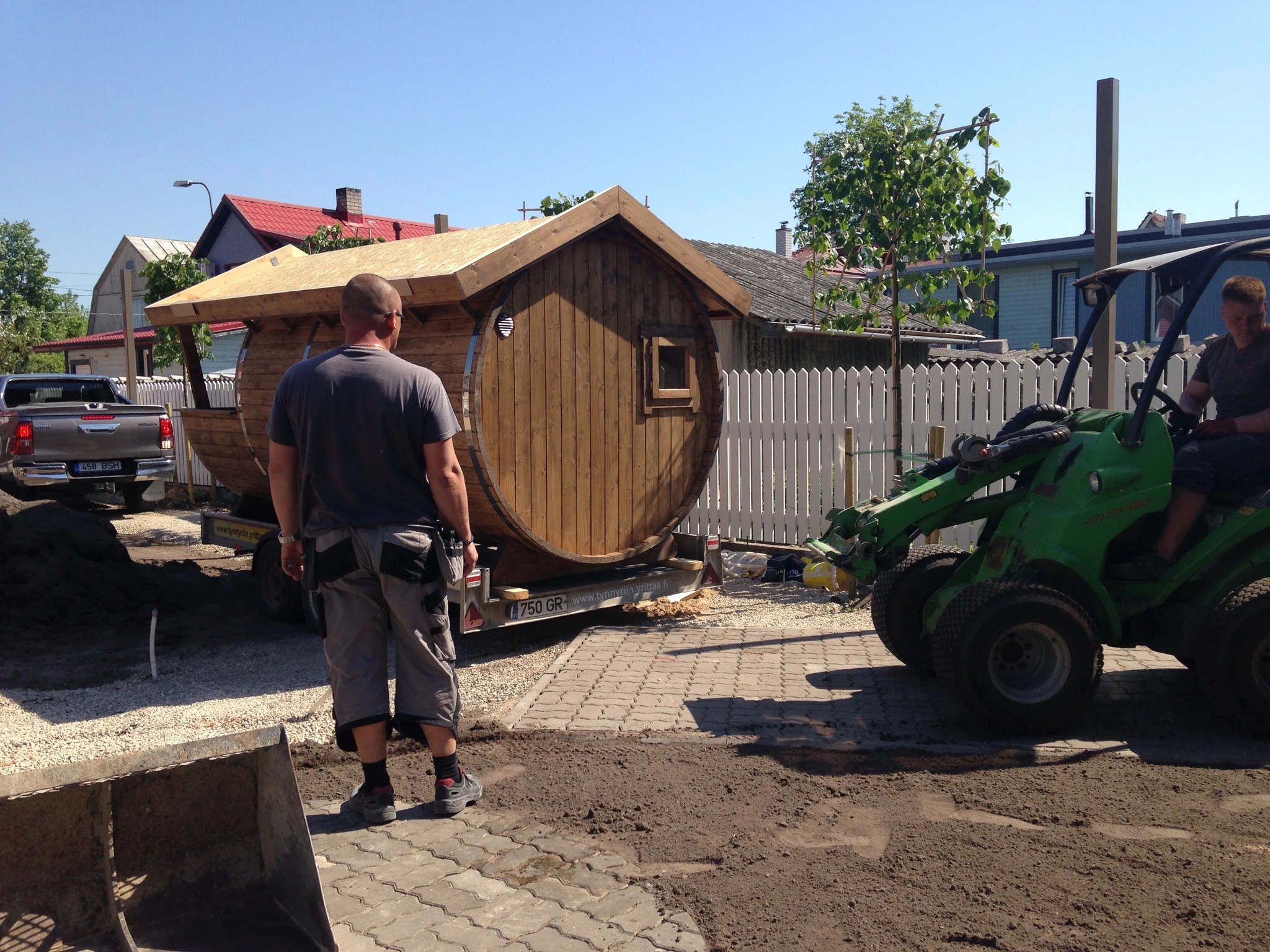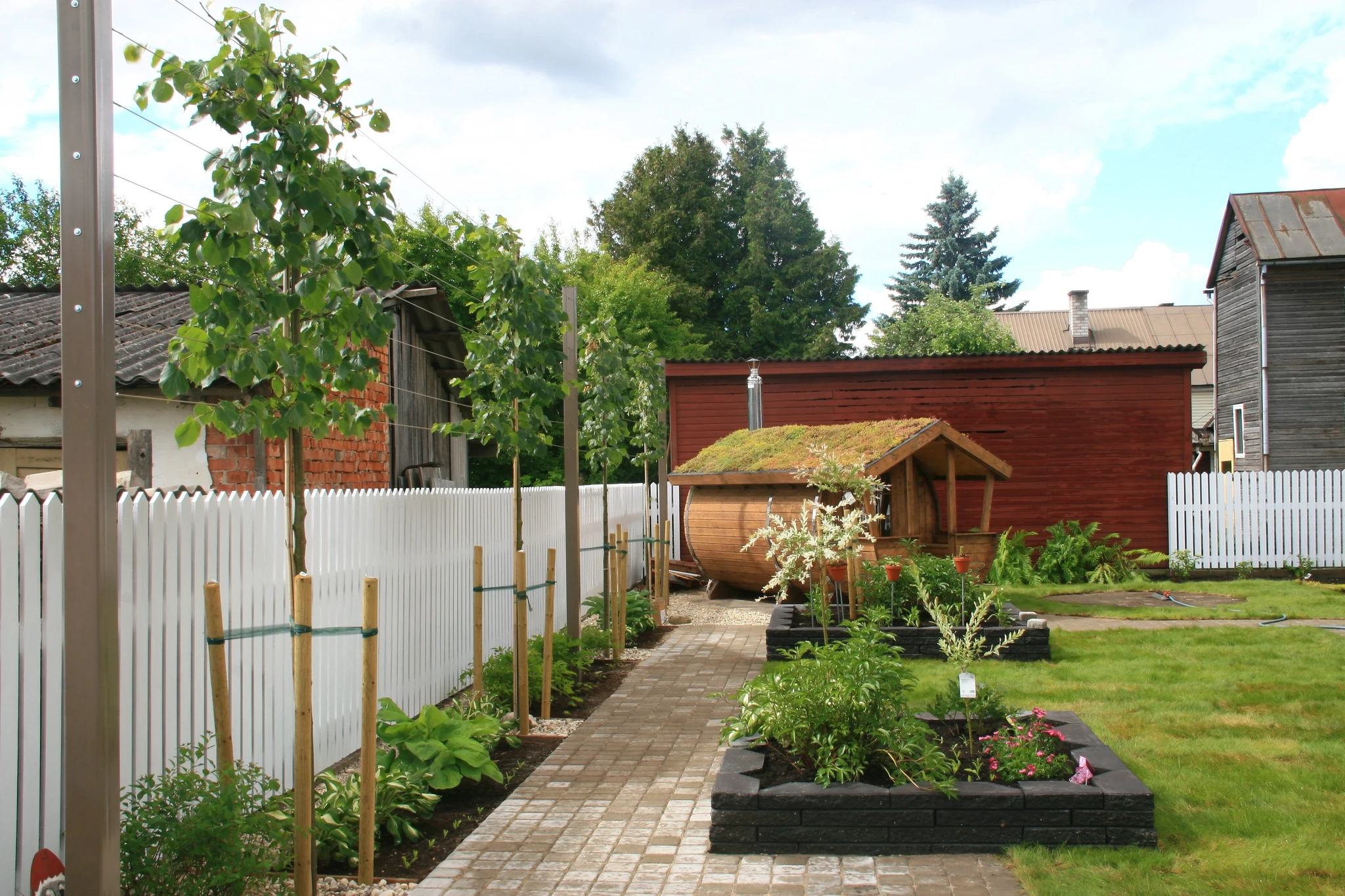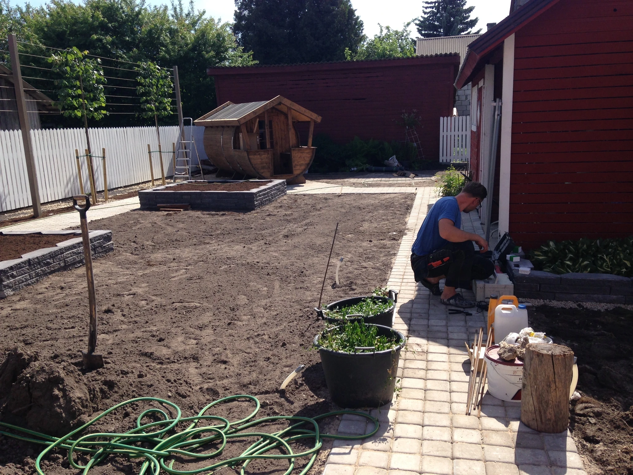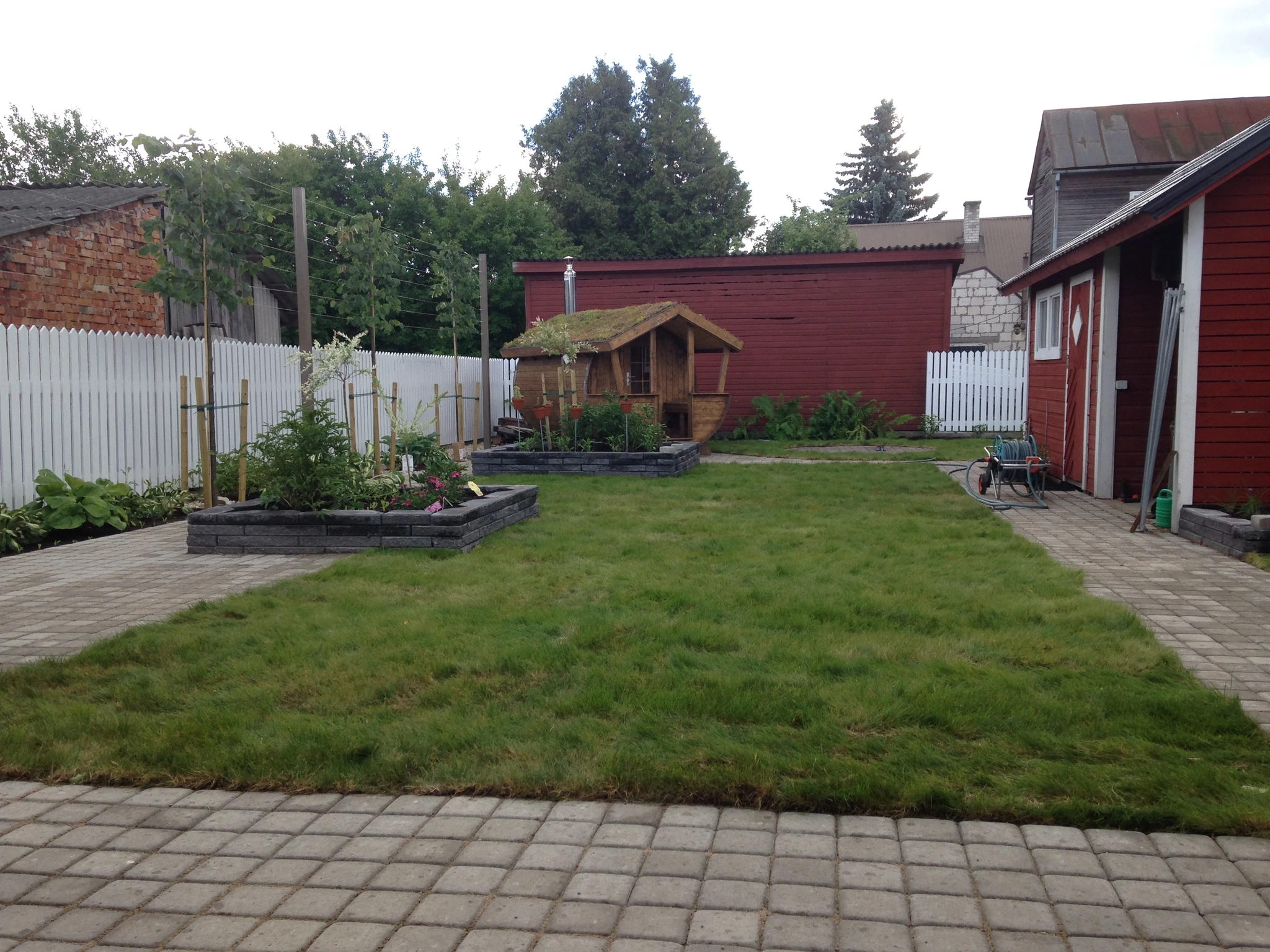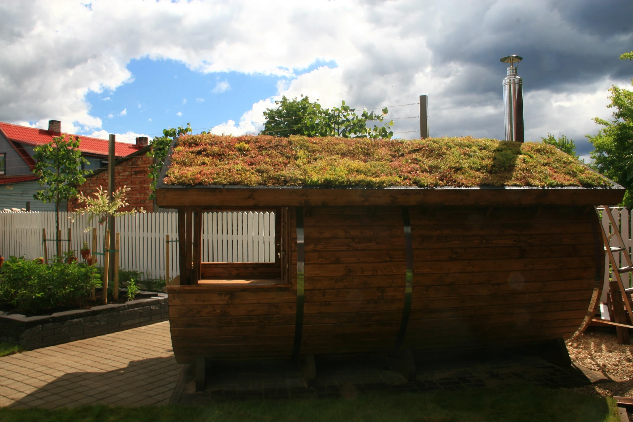 Tünnisauna katusele läksid kasvama ettekasvatutud kukeharjamatid. Sauna kõrvale sillutuskivialusele väike teisaldatav bassein West Highland terjerist koer Nappi´le.
