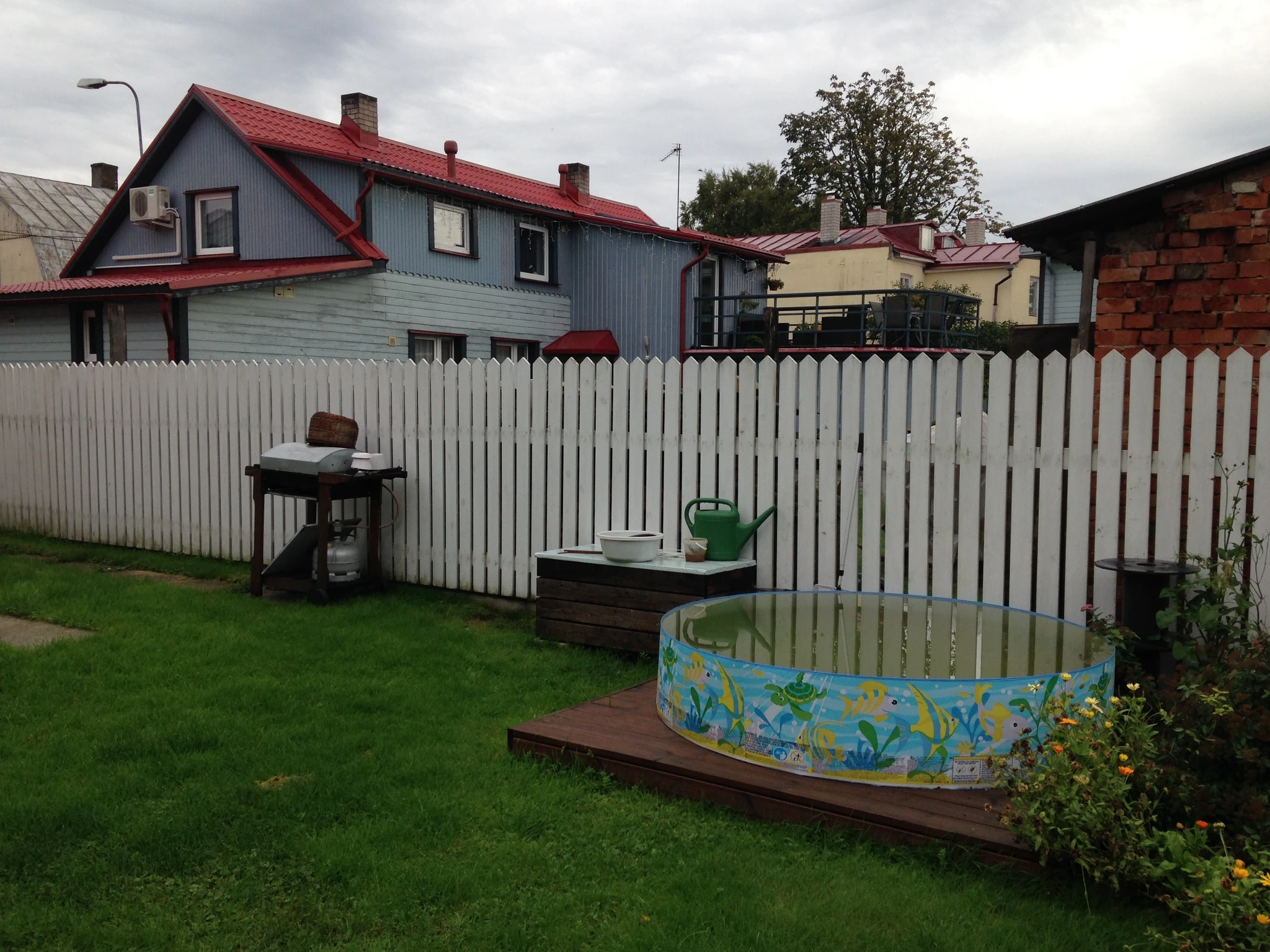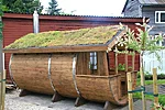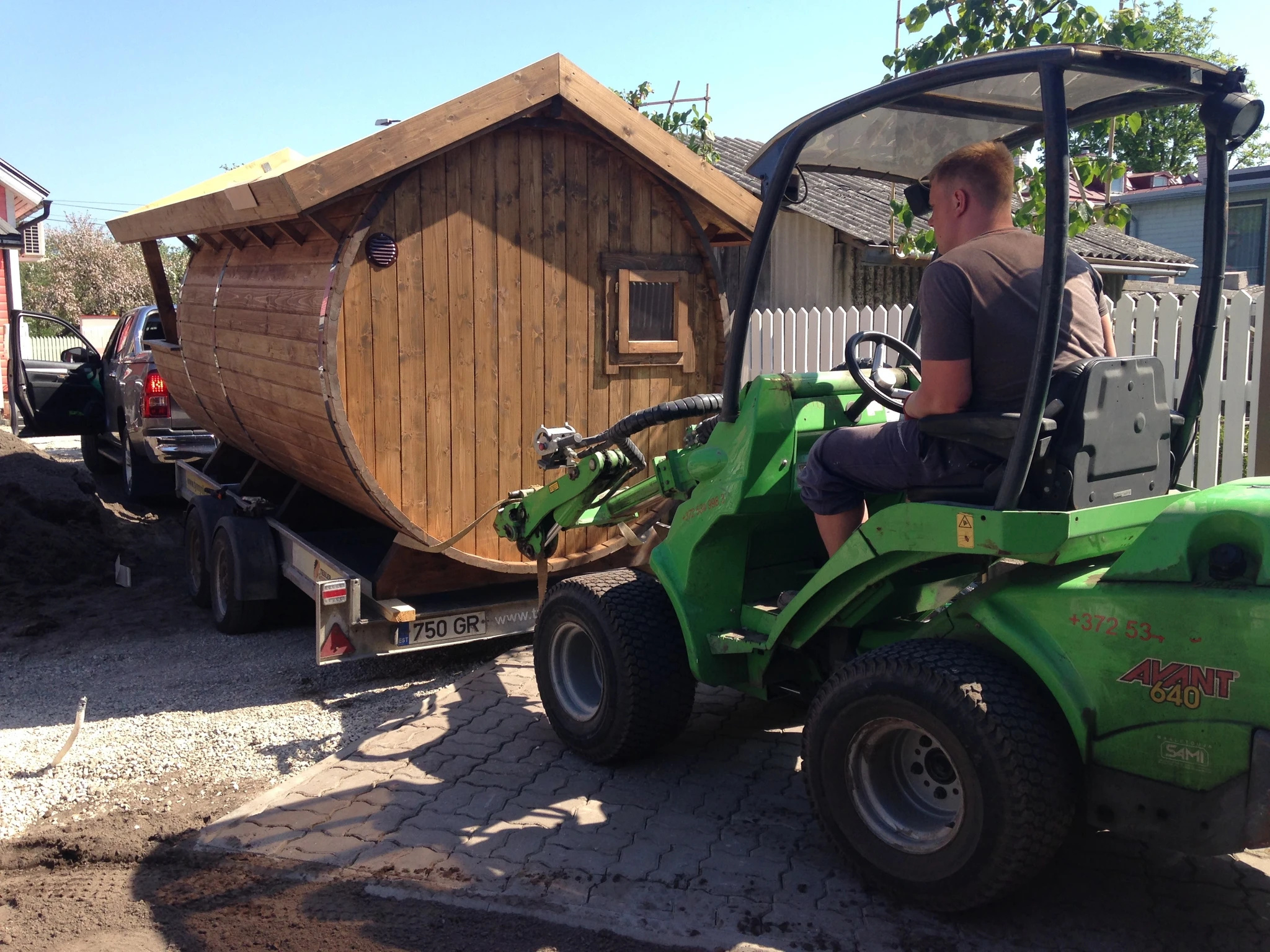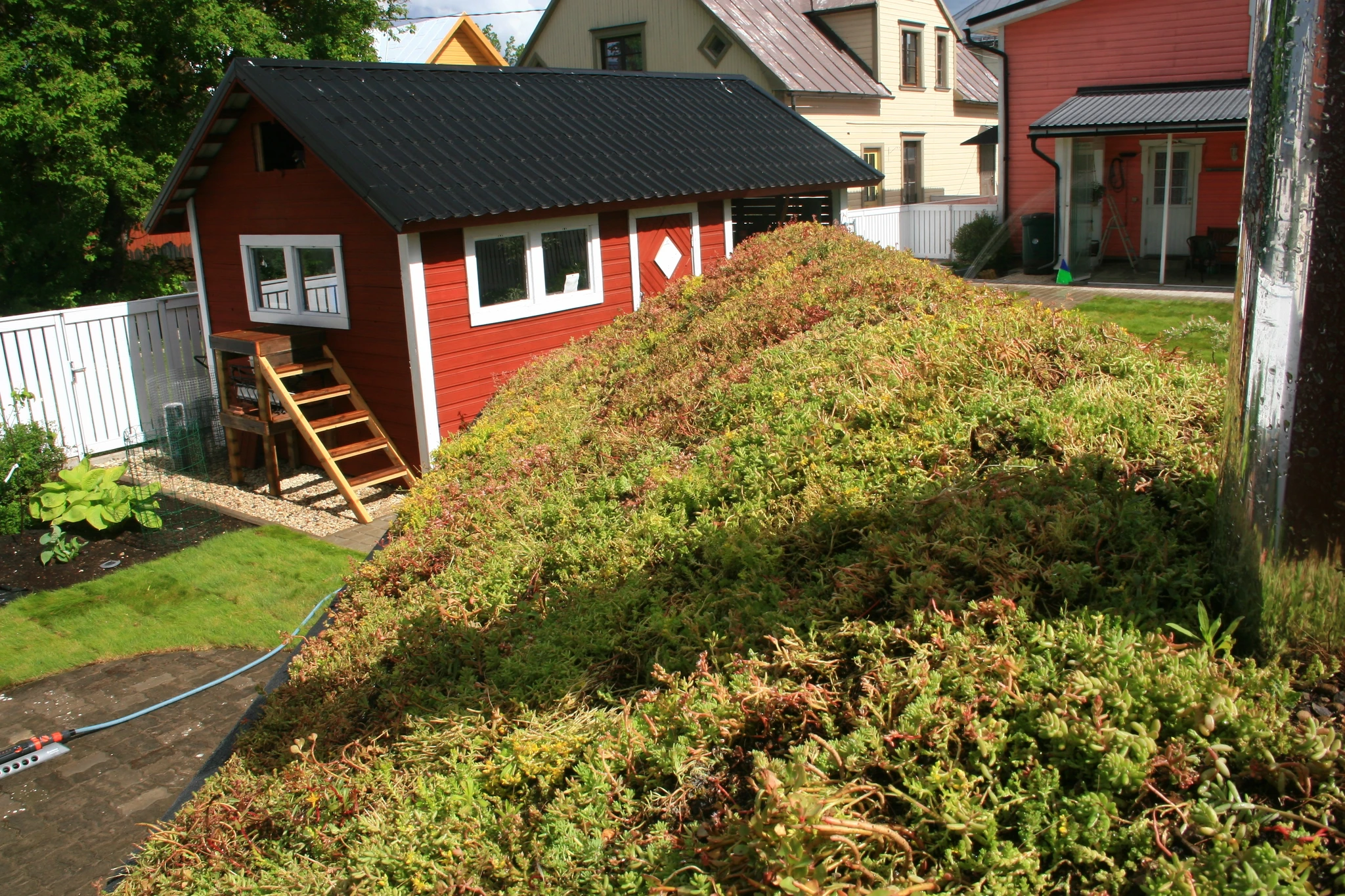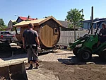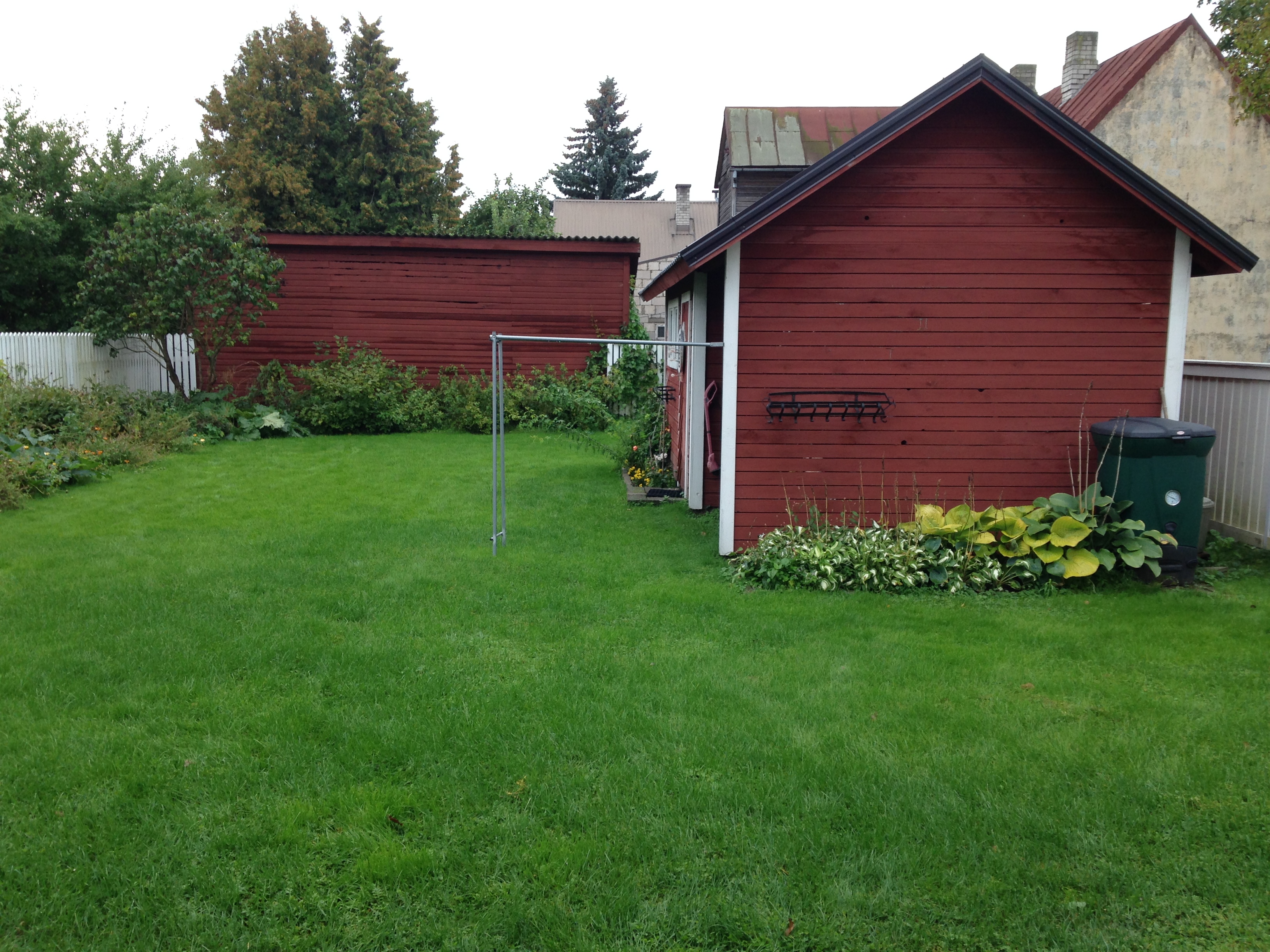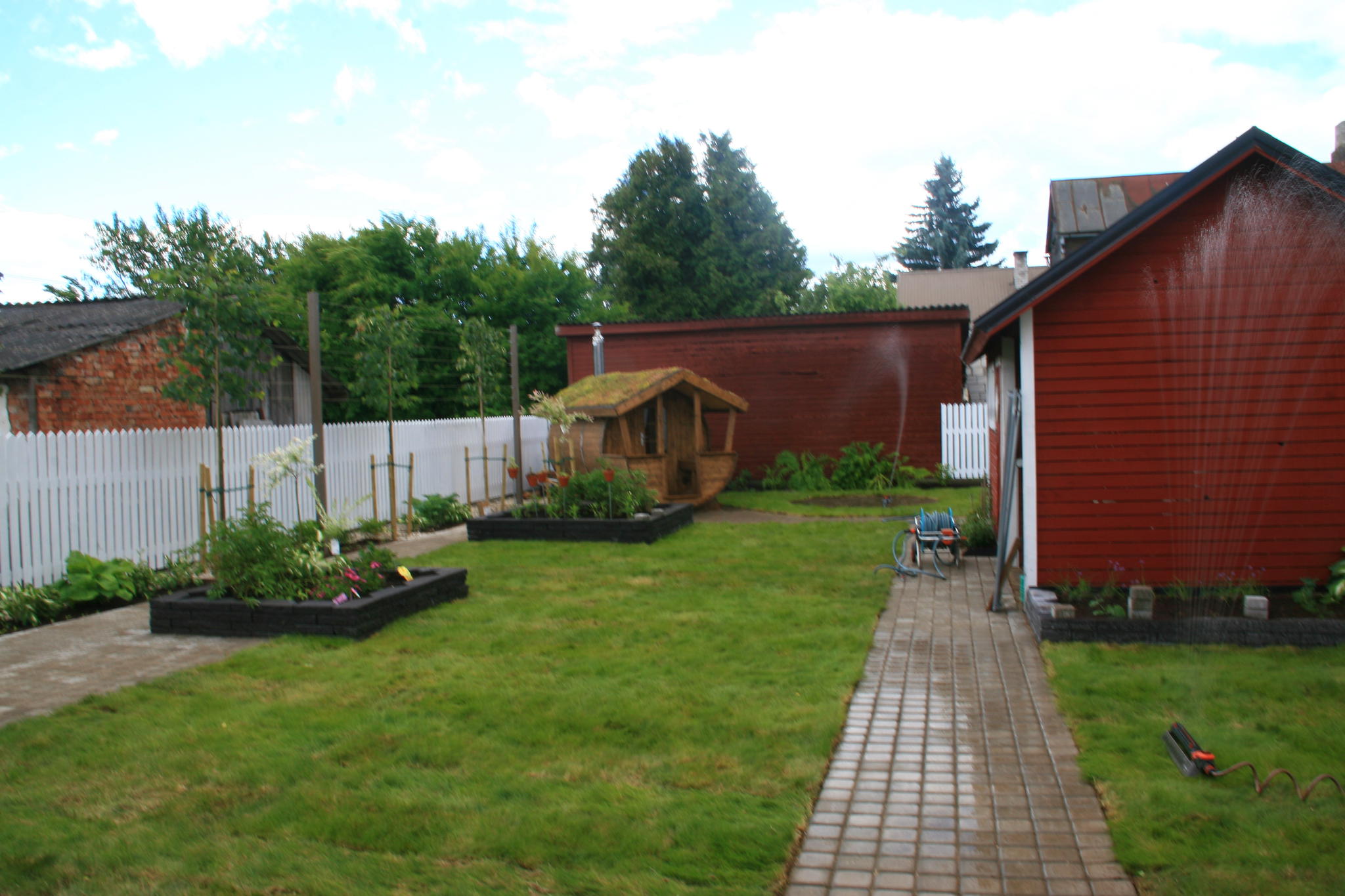Tünnisauna katusele läksid kasvama ettekasvatutud kukeharjamatid. Sauna kõrvale sillutuskivialusele väike teisaldatav bassein West Highland terjerist koer Nappi´le.