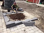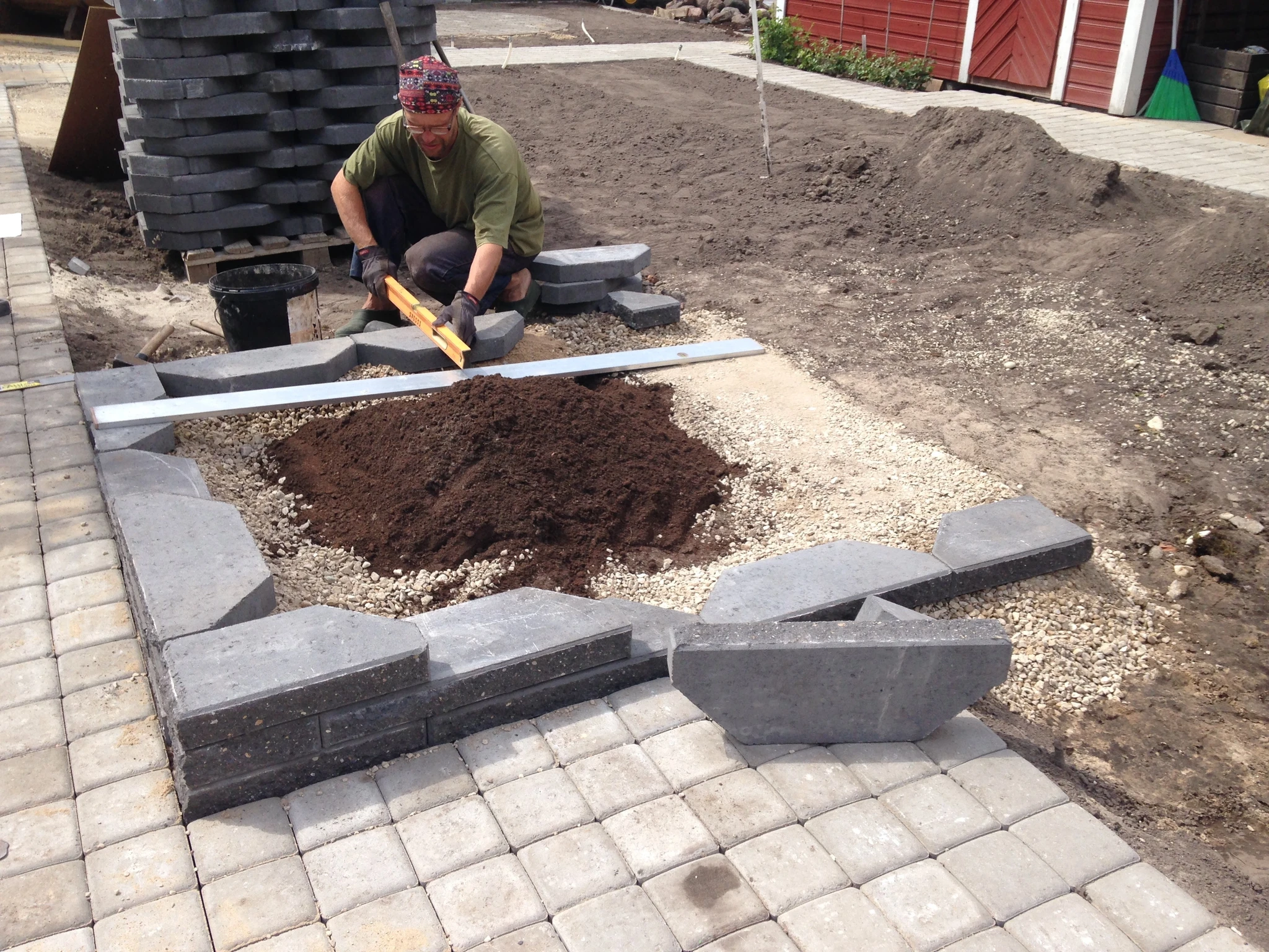 Ikodor tumehalli müürikiviga laotud kõrgpeenrad lisavad aeda struktuuri ja mahtu ning hele sillutuskivi annab kontrasti.
